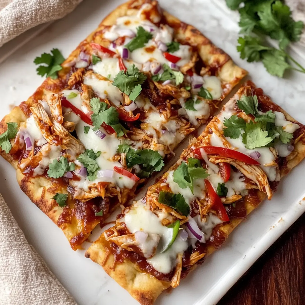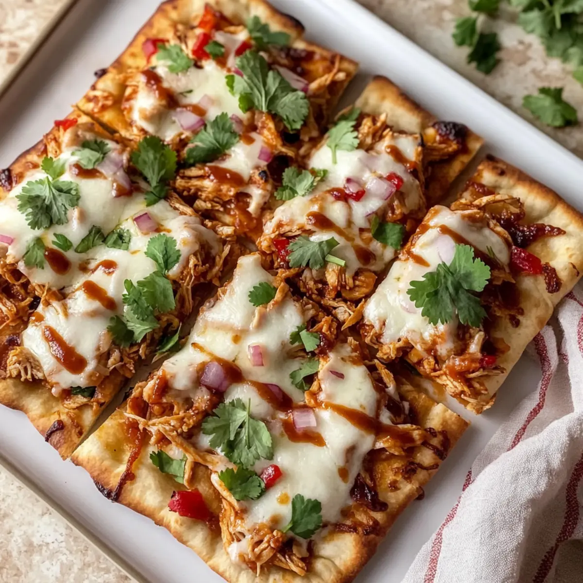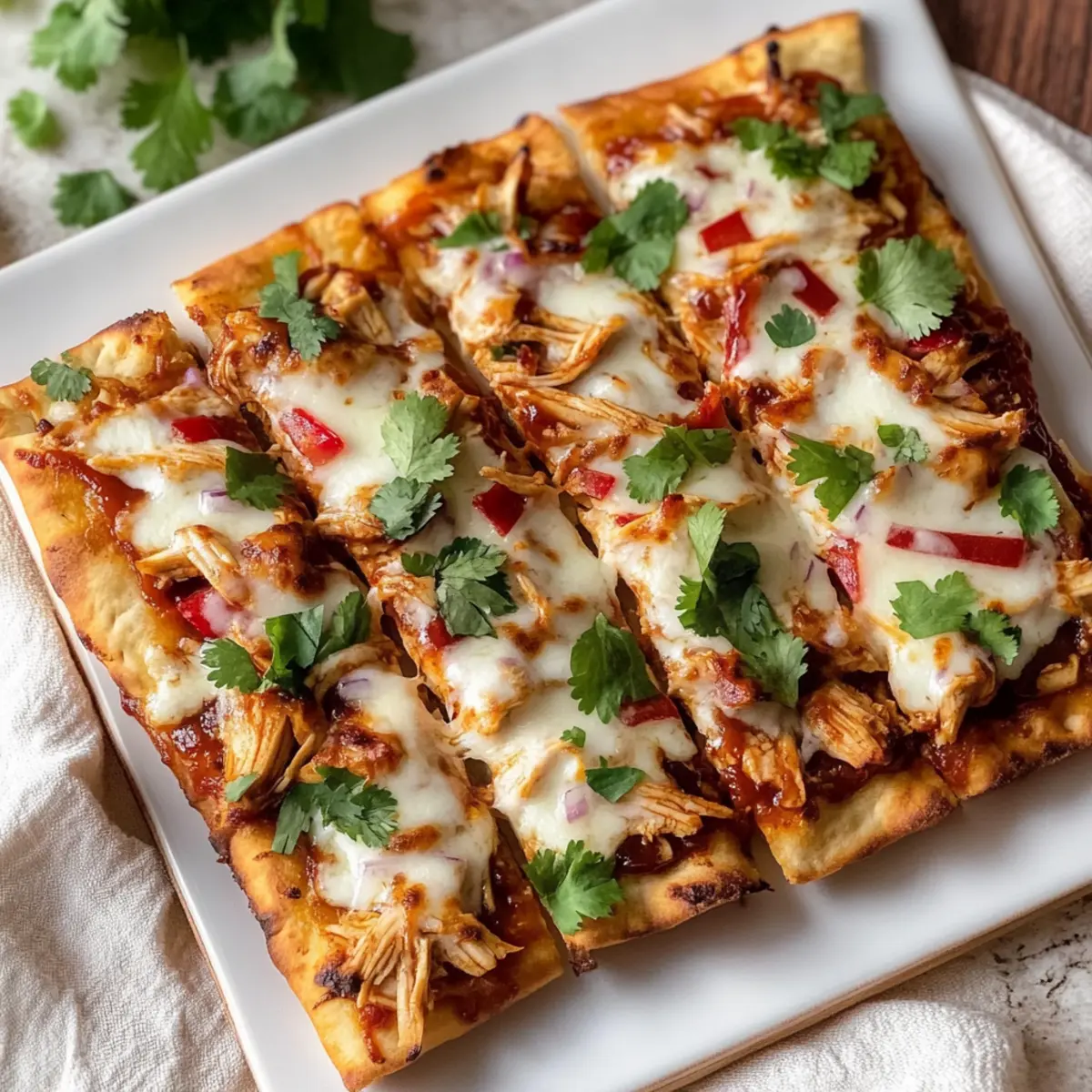 Once the BBQ Chicken Flatbreads are out of the oven, allow them to cool for a minute. Top with freshly chopped cilantro for a burst of color and flavor. Slice each flatbread into pieces and serve warm. They make a delightful meal that’s both quick and satisfying!