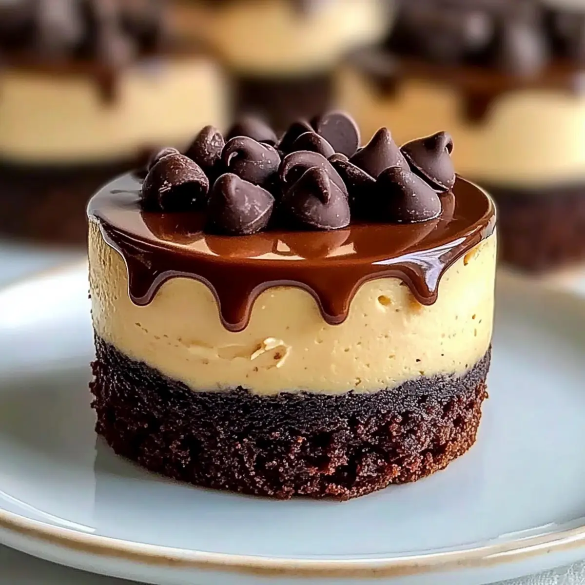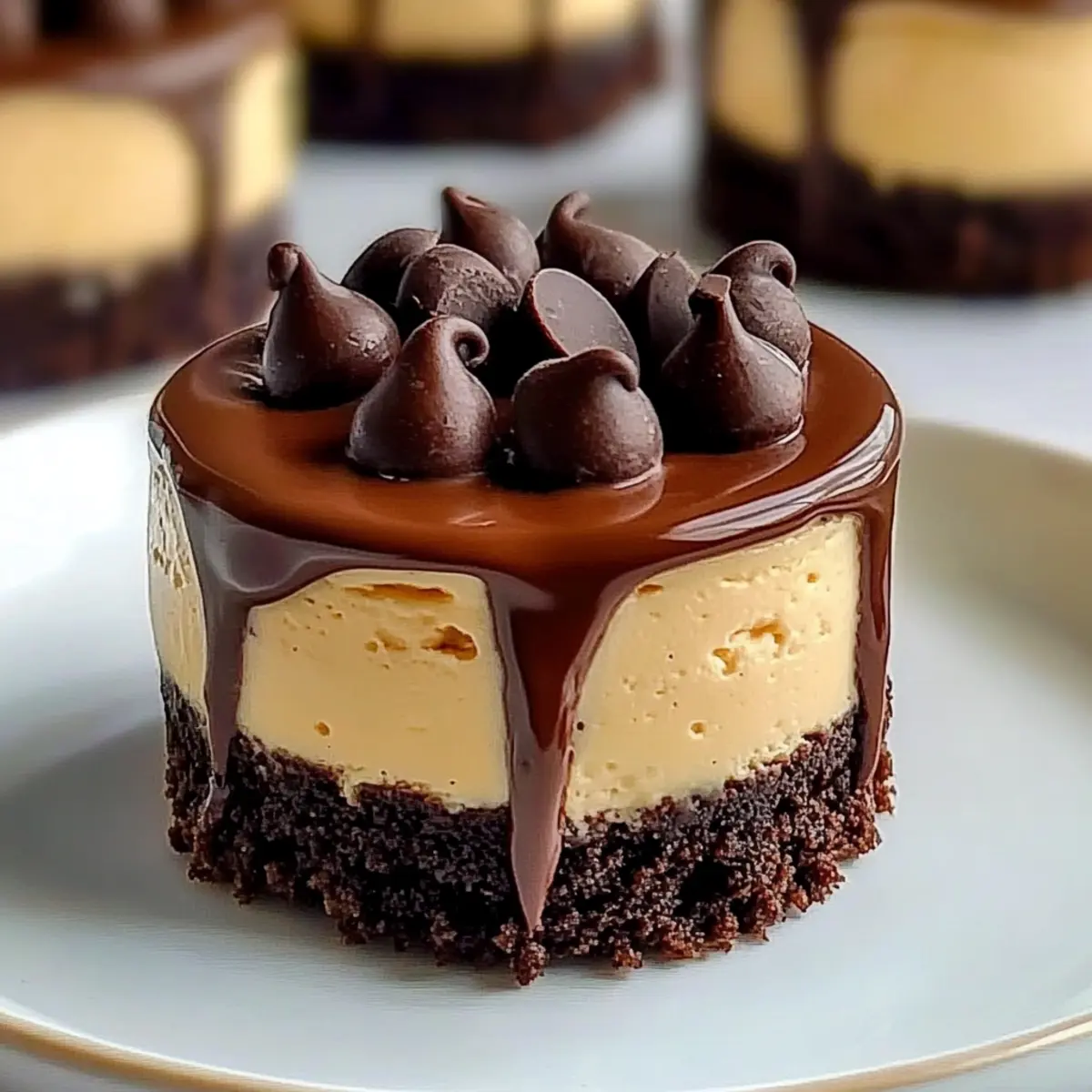 - Spoon ganache over each cheesecake and sprinkle with mini chocolate chips before serving.