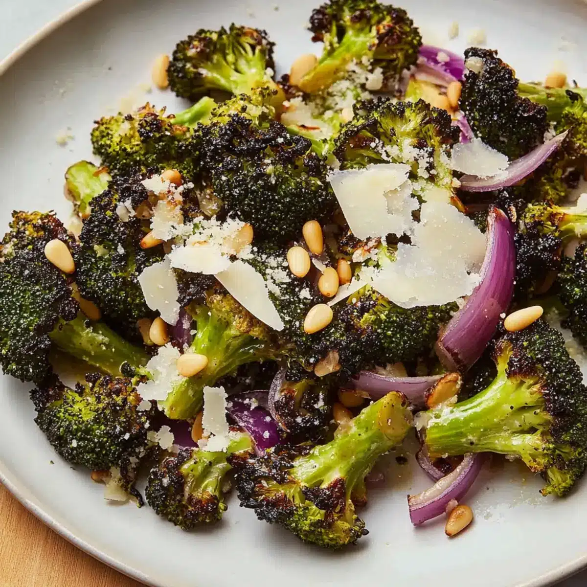 Transfer your beautifully mixed Charred Broccoli Salad onto a serving platter. Top it with shaved Parmesan cheese, toasted pine nuts or slivered almonds, and a sprinkling of fresh parsley for added color and texture. This salad can be served warm or at room temperature for a delightful meal!