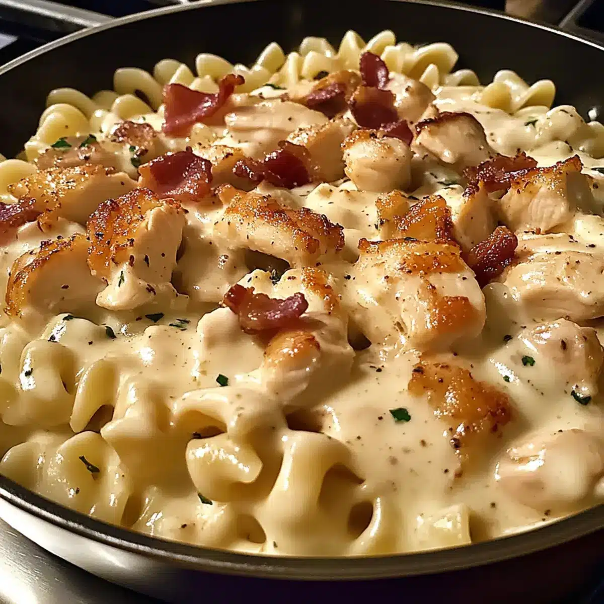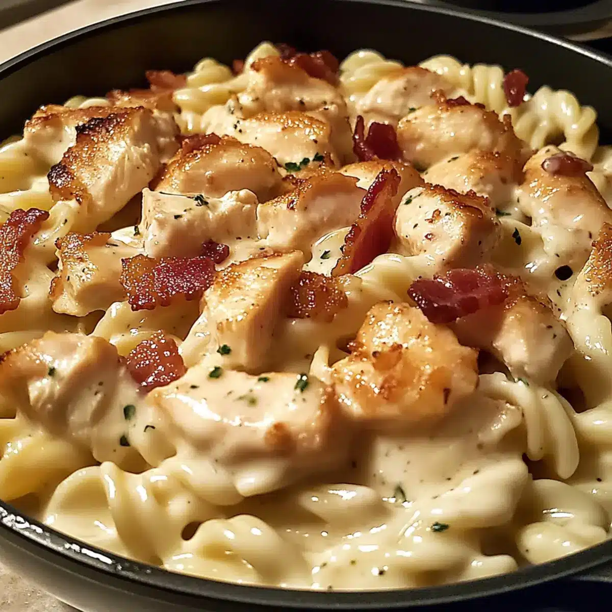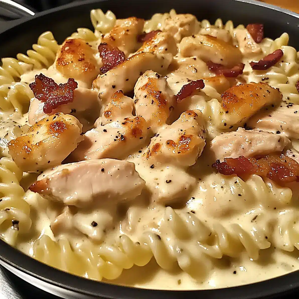 - Add the drained pasta and cooked chicken to the sauce, tossing to coat. Crumble bacon on top before serving.