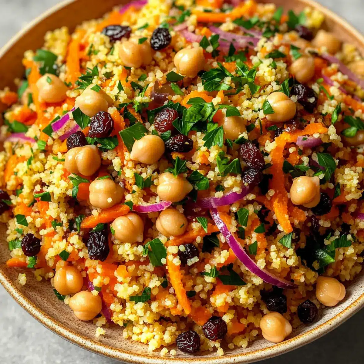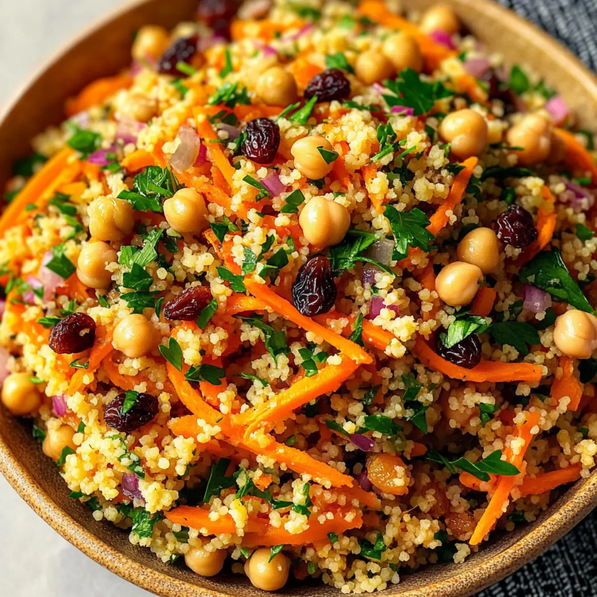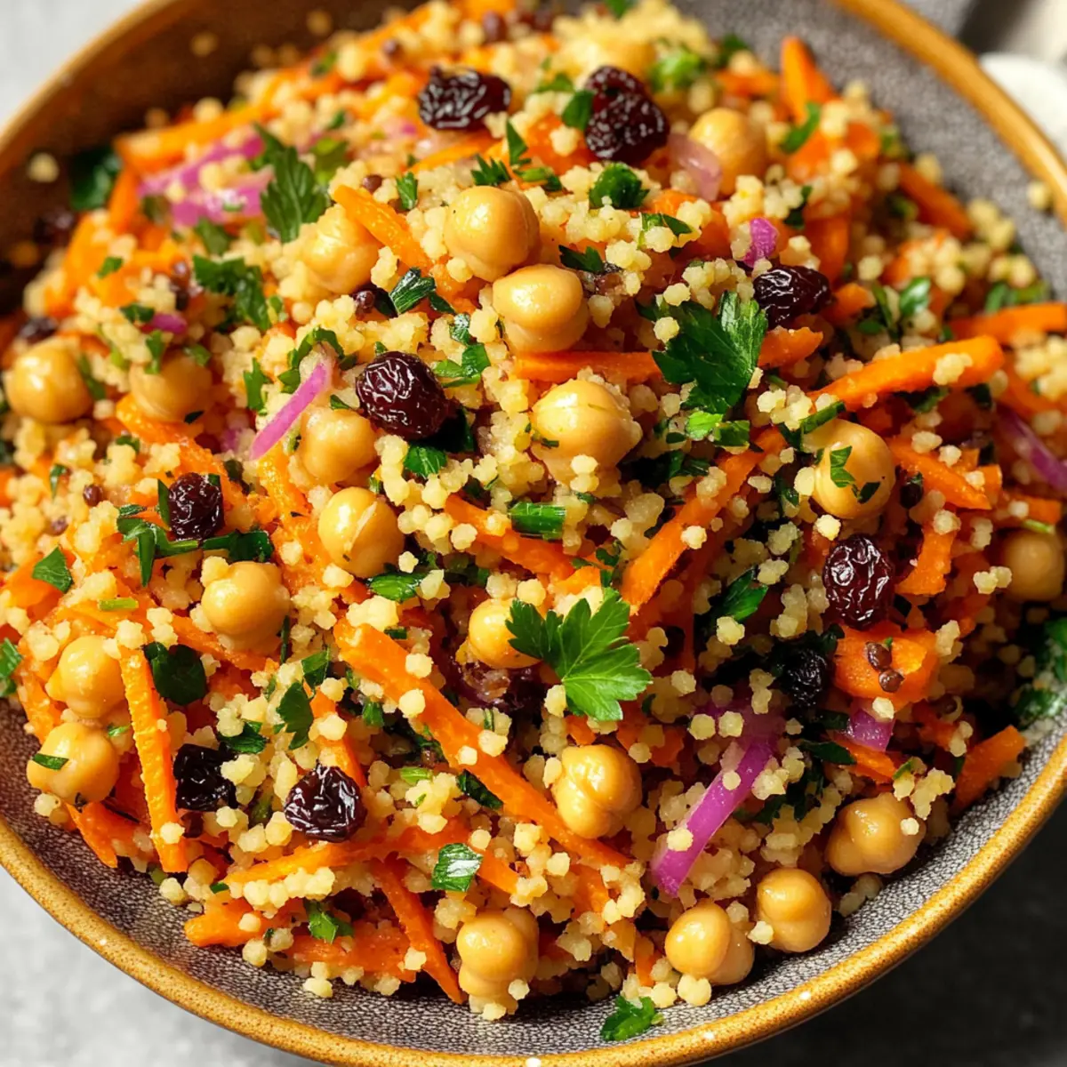 - In a large bowl, combine fluffed couscous, grated carrots, chickpeas, red onion, raisins, and parsley. Toss gently to mix.