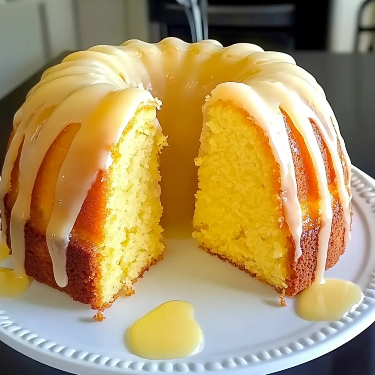 Once the cake is completely cool, drizzle the prepared glaze over the top, allowing it to flow beautifully down the sides of the cake. The glaze will harden slightly for a gorgeous finish. Now, your Delicious Lemon Cake is ready to be served, offering a perfect blend of moist cake and tangy sweetness that’s sure to please everyone!