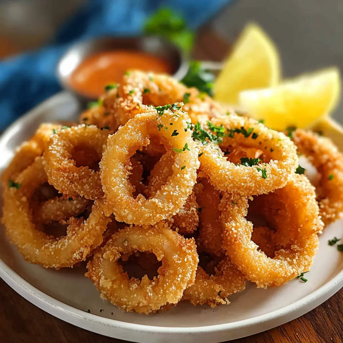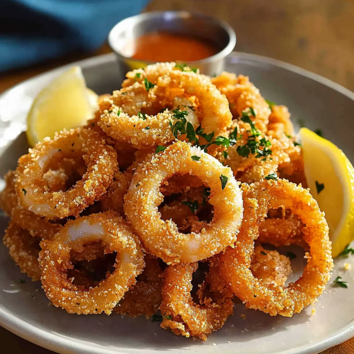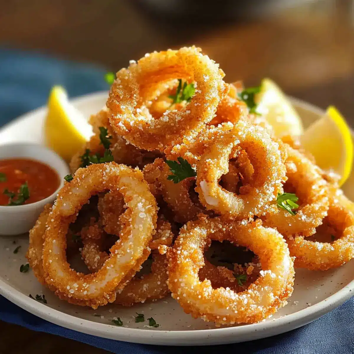 Great question! Fried calamari pairs beautifully with zesty marinara sauce for dipping, but you can also whip up a tangy lemon butter sauce or a creamy aioli for a flavorful twist. A sprinkling of fresh herbs like parsley can also brighten up the dish, and don’t forget those lemon wedges for an extra zing!