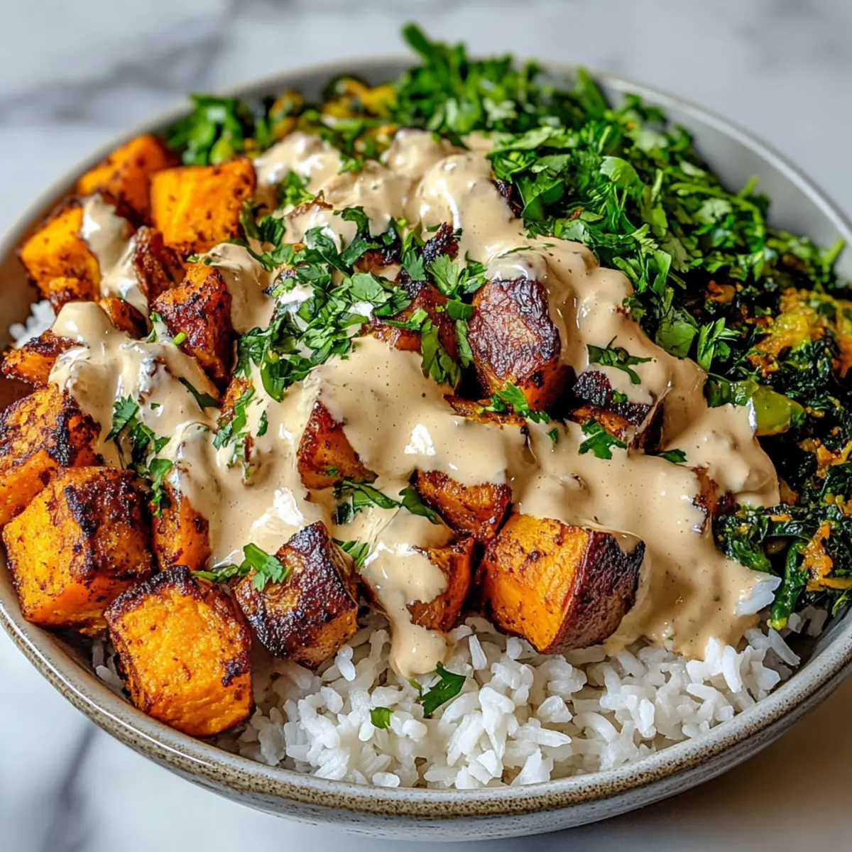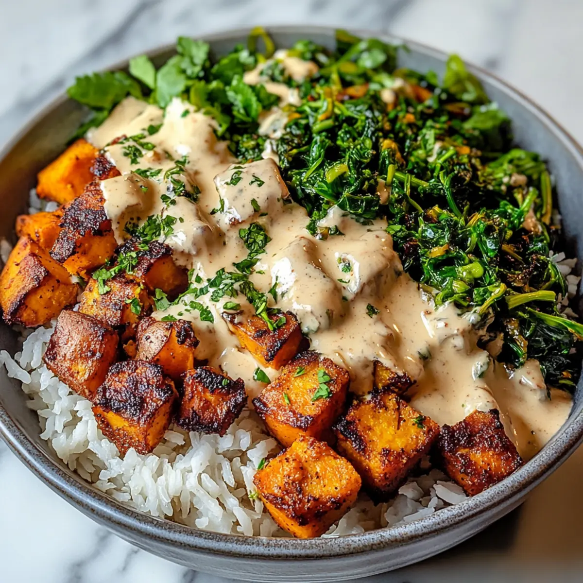 Roasted Broccoli: Tender, caramelized broccoli offers a delightful crispness that beautifully harmonizes with the sweet potatoes and creamy sauce.