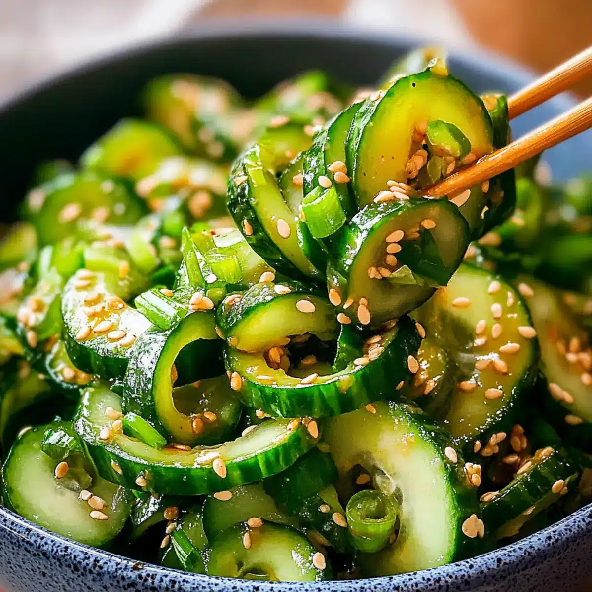 For the best flavor experience with your Korean Cucumber Salad, serve immediately or let it marinate for 15 minutes. This marination time enhances the dressing’s flavor, allowing it to soak into the cucumbers. Before serving, feel free to garnish with additional sesame seeds and green onions for a pop of color and extra crunch.