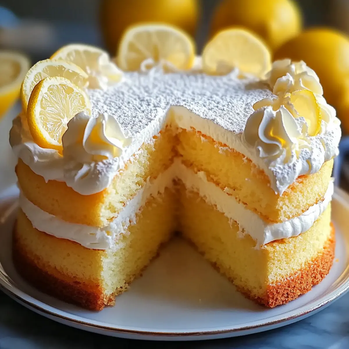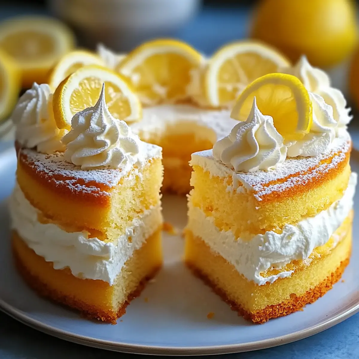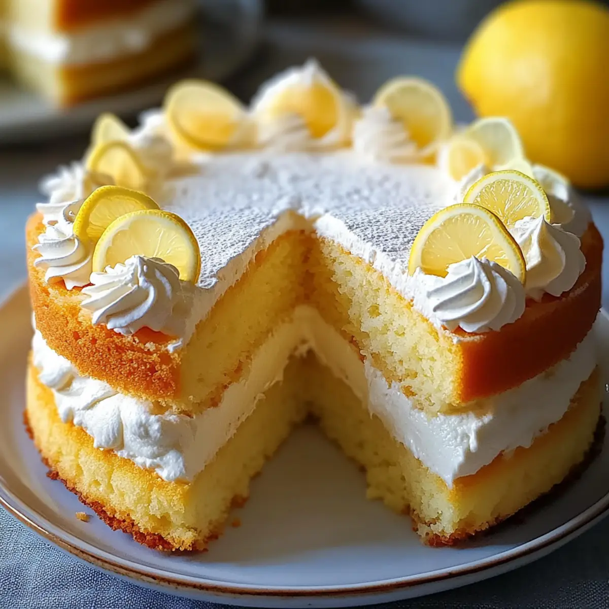 Once the cake is completely cool, pipe whipped cream rosettes on the top using a pastry bag, creating a beautiful presentation. Dust the finished Lemon Cloud Cake with powdered sugar for an elegant touch. Serve it with fresh berries or lemon curd for an added zing, making it a delightful centerpiece at your gathering.