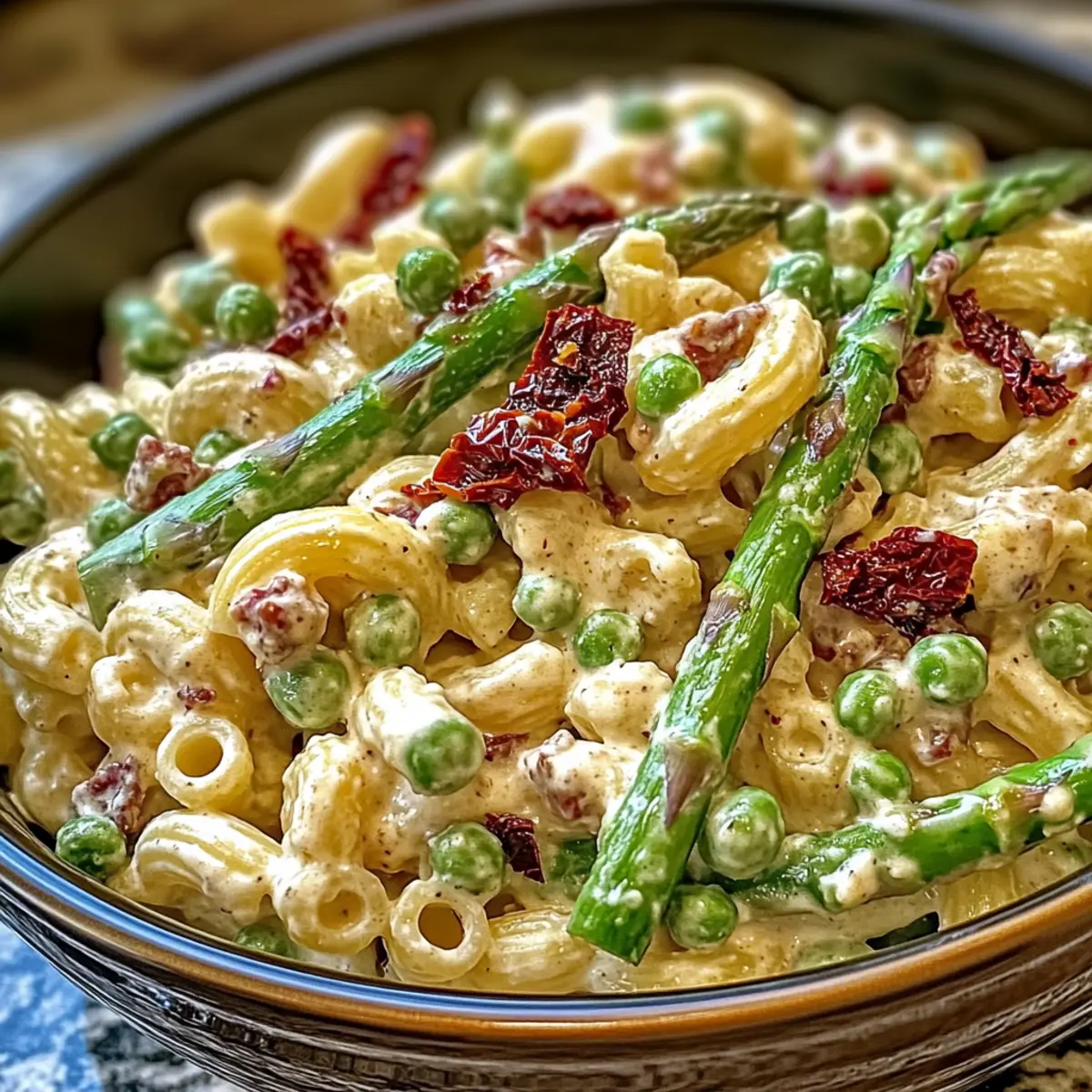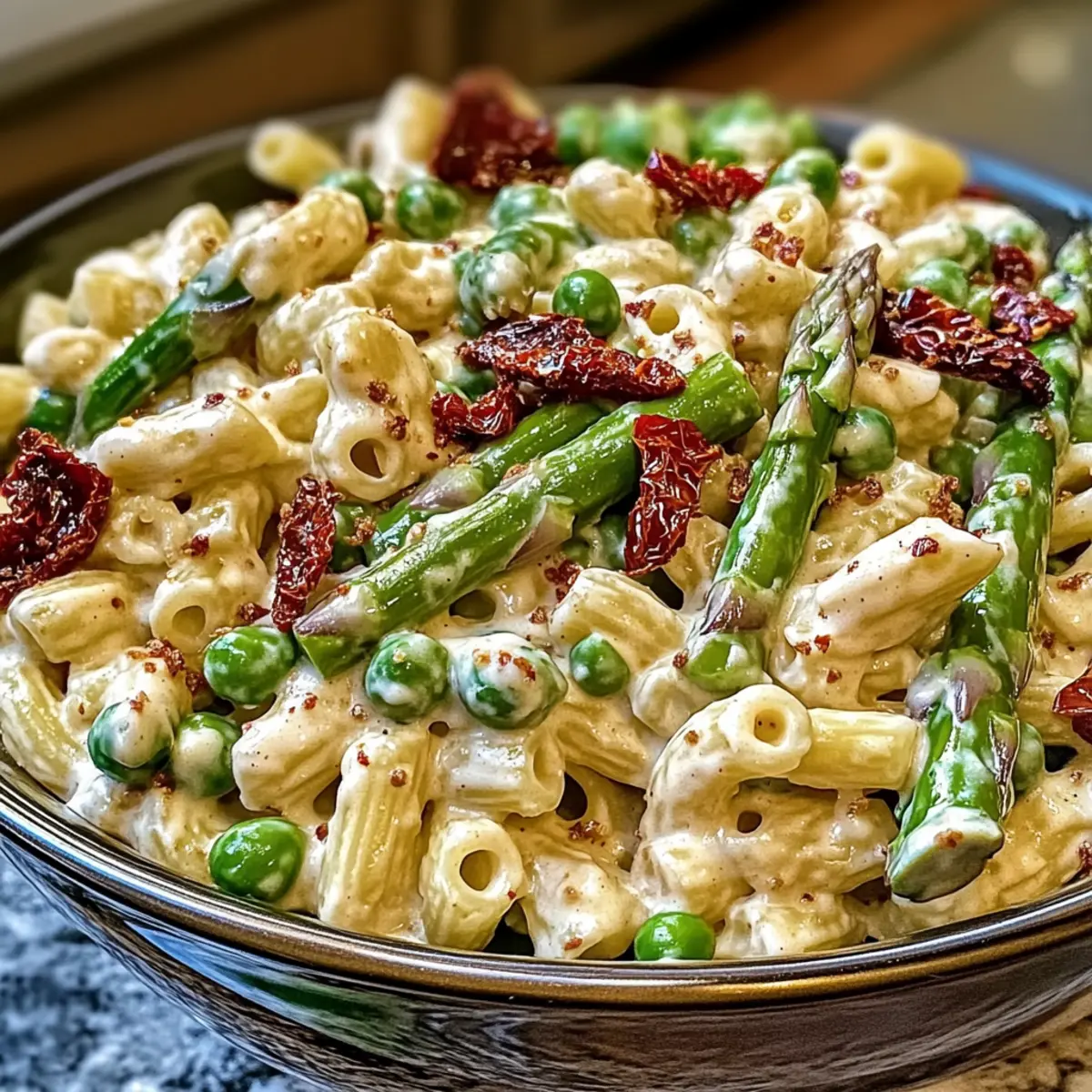 To avoid mushiness, cook the elbow macaroni until it’s al dente—about 8-10 minutes in boiling salted water. Keep an eye on it during the last few minutes of cooking when you add the asparagus and peas; this will help maintain both the integrity of the pasta and the crispness of your veggies.