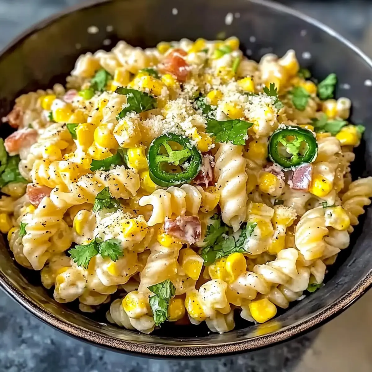 - Combine cooled pasta, charred corn, mayonnaise, lime juice, cotija, cilantro, and jalapeño in a bowl. Toss gently.