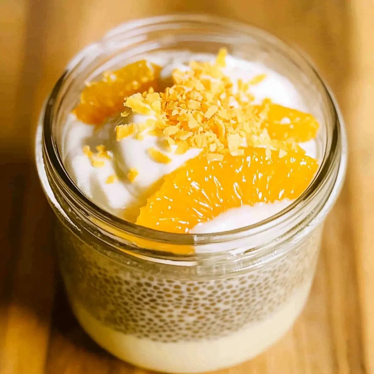 - In a medium-sized mason jar, mix in the orange juice, coconut milk, chia seeds, maple syrup, and vanilla extract until well combined.