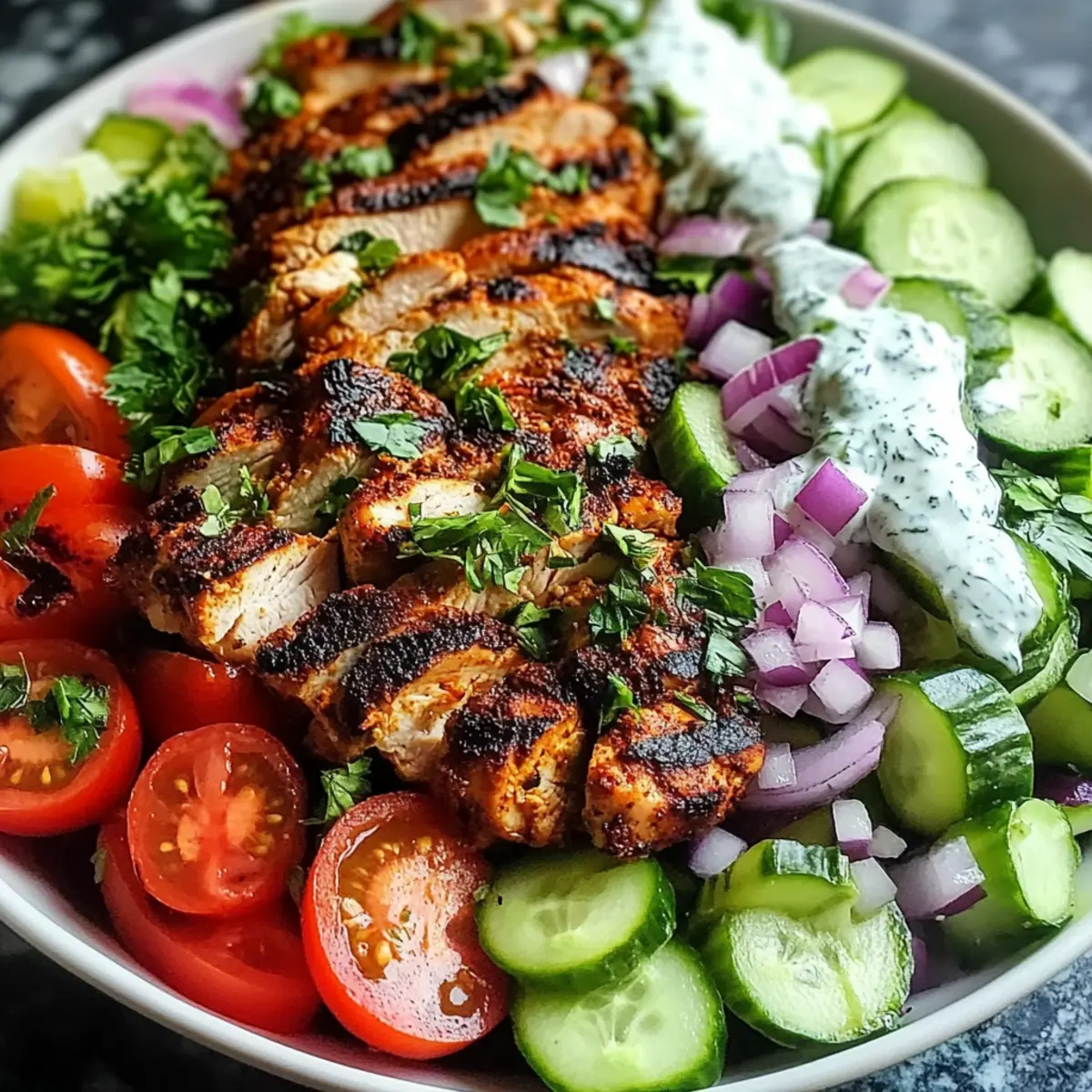 To serve, divide the salad mixture into plates or bowls. Slice the rested grilled chicken and arrange it on top of the salad. Generously drizzle the creamy yogurt dressing over the chicken and greens, and finish by garnishing with extra parsley for a touch of freshness. Your Spiced Grilled Chicken Salad is now ready to delight!
