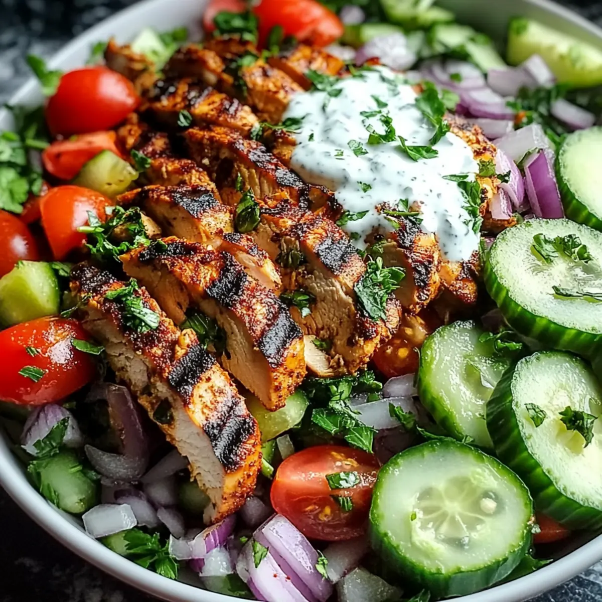 While the chicken is resting, take a large mixing bowl and add diced cucumbers, juicy tomatoes, thinly sliced red onion, and fresh parsley. Toss the ingredients gently to mix, creating a colorful bed for your grilled chicken. This vibrant mixture will pair perfectly with the rich flavors of the Spiced Grilled Chicken Salad.