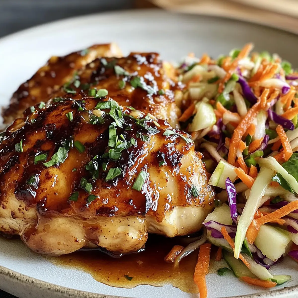 - Plate the sticky chicken thighs next to a generous helping of the autumn slaw. Garnish with fresh herbs, such as chopped parsley or chives, for presentation.